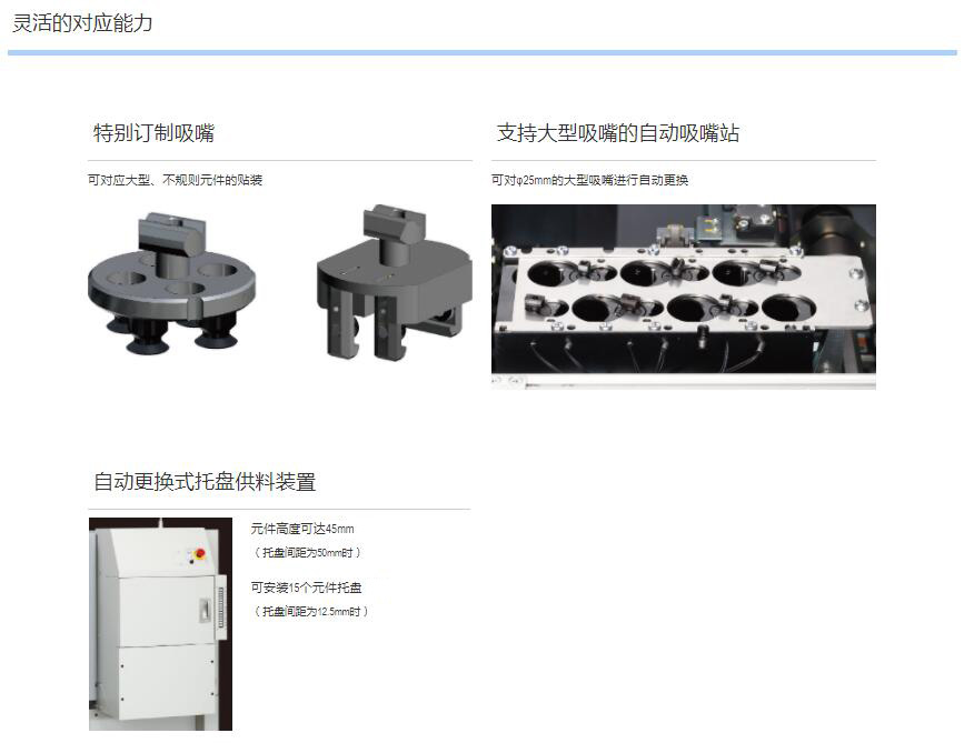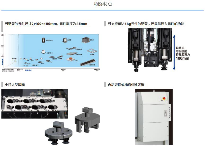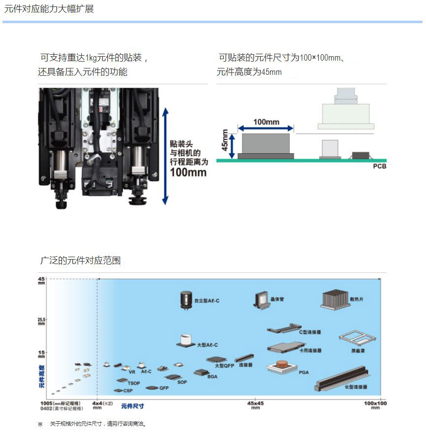 1.可貼裝較大尺寸達100mm×100mm、高達45mm的元件。