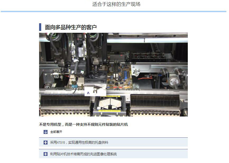 YC8 支持大型、不規(guī)則元件的小巧型模塊式貼片機 1.可貼裝較大尺寸達100mm×100mm、高達45mm的元件。2.支持貼裝重達1kg的元件,還具備壓入元件的功能。3.機身僅寬880mm的小型化設(shè)計,可大限度地有效利用空間。4.支持可裝15張托盤的自動更換式托盤供給裝置 ATS15。5.支持SS型電動送料器與ZS型電動送料器。